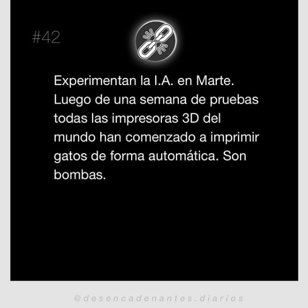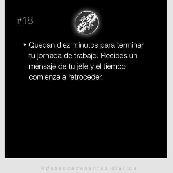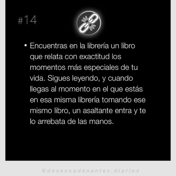 Proyecto personal para incentivar la escritura creativa entre los usuarios de Instagram. Micro relatos, diálogos, consignas o lo que haga falta para detonar la imaginación. Eso sí, el final queda en manos de quien quiera interactuar. Un ejercicio literario libre que busca conflictos y dramas para dar vida a historias distintas, sin cadenas, reglas o moldes.